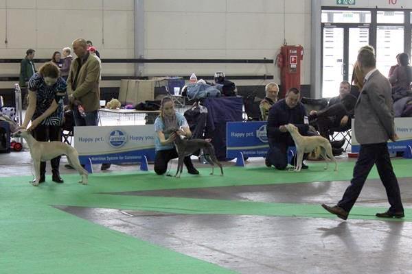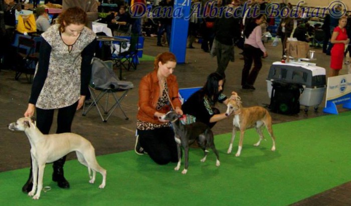 V sobotu posuzoval Dr. György Tesics - rozhodčí původem z bývalé Jugoslávie, nyní žijící v Maďarsku, tohoto rozhodčího jsem měla tu čest poznat v Náměšti nad Oslavou na Speciální výstavě chrtů v roce 2005 ,kdy od něj získali CAC všichni tři sourozenci mého B vrhu - Badalucco, Belcanto a Brilance Petula-Vera. Navíc tehdy 10ti letá Desinka Nejlepšího veterána. Proto také vím, že je to velice příjemný, slušný a sympatický chlapík :-) Mladé fenky posoudil takto: V1,CAJC - Fantasy Edition Petula-Vera, V2 - Fierce Fireball Adrenalin a V3 - Harmonie De La Vie Toomie Trishel. Majitelka Fansy psala, že je velmi dlouho posuzoval, na stole řádně osahal, odstupoval a znovu osahal a pak několikrát sami v pohybu a společně v pohybu...prostě pečlivě. Fansy se mu moc líbila, uvažoval i nad BOB ale nakonec říkal, že pro dnešní den se mu více líbí fenka Courtborne Ravenclaw, která získala titul BOB.