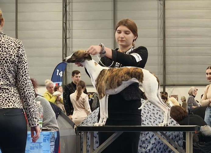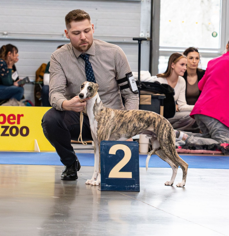 26.7.2025 Klubová výstava Whippet klubu Bordovice - třída dorostu: Velmi nadějný 1, Nejlepší dorost klubové výstavy/ very promising 1, Best Puppy in Club Show (3 psi) - judge A.Kochan PL